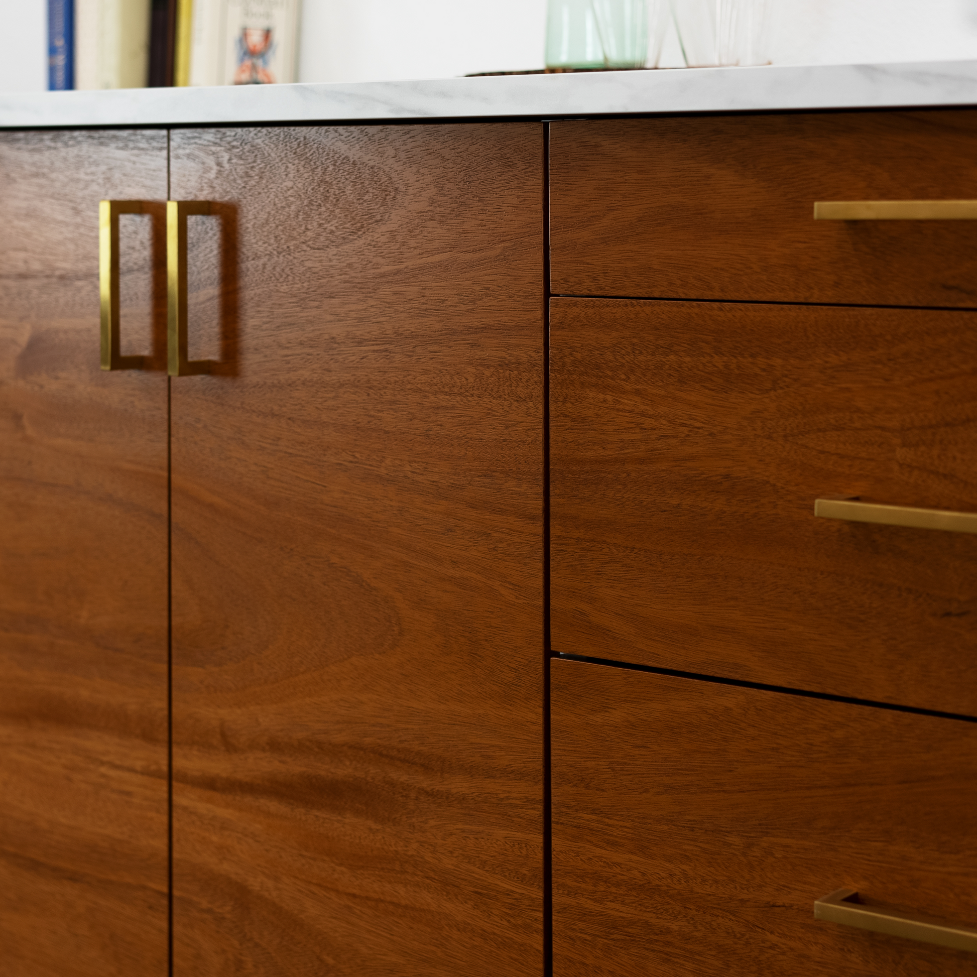 Sequenced sheets of real wood veneer tell a story individually yours, and never duplicated. Mahogany in all of its rich color differentiations in wood variation make this a beautiful choice for a kitchen.