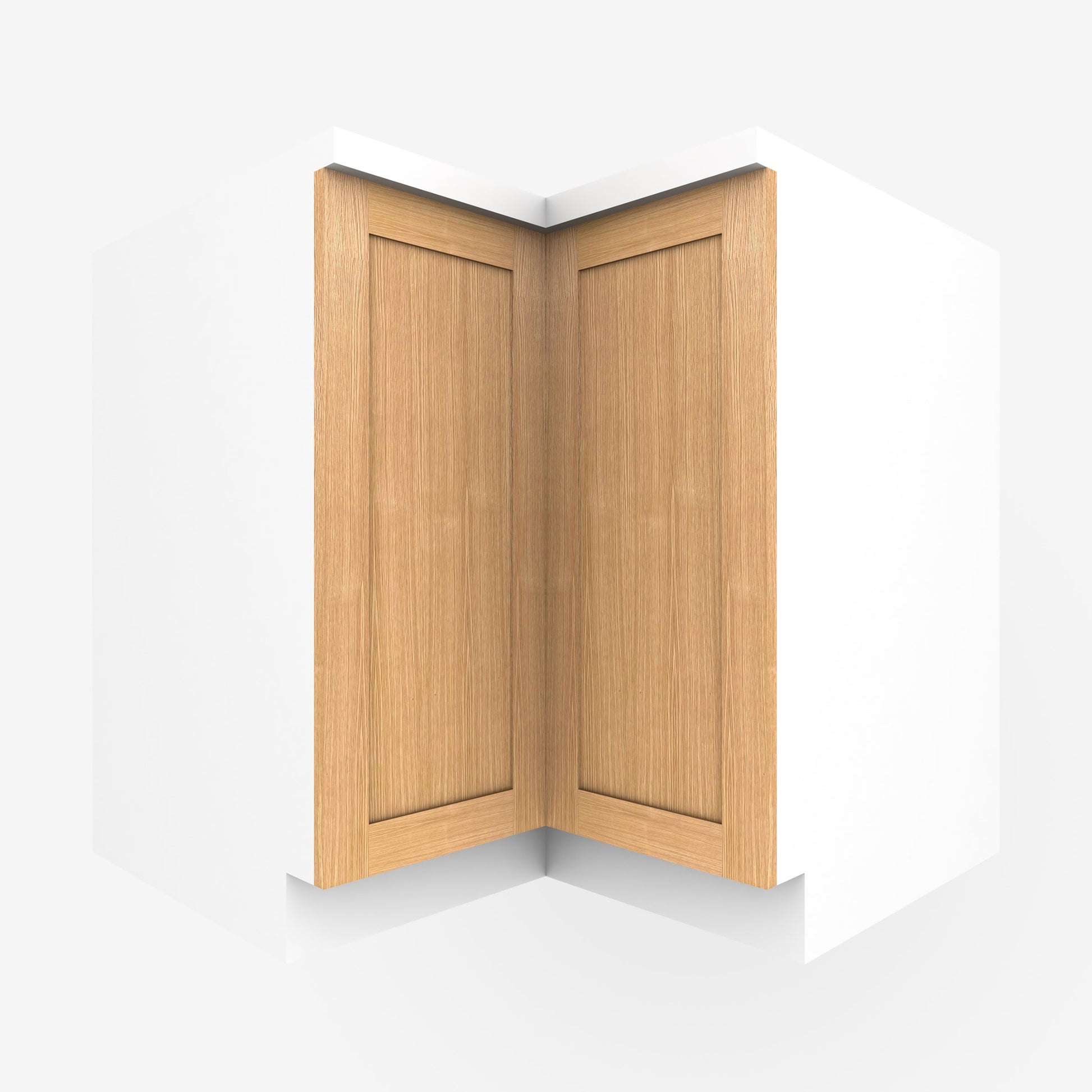 2-piece corner base cabinet door set for L- or U-shaped kitchens. Our Wood Shaker cabinet doors features a wide frame and a solid wood inset center panel to amp up its modern and clean profile.